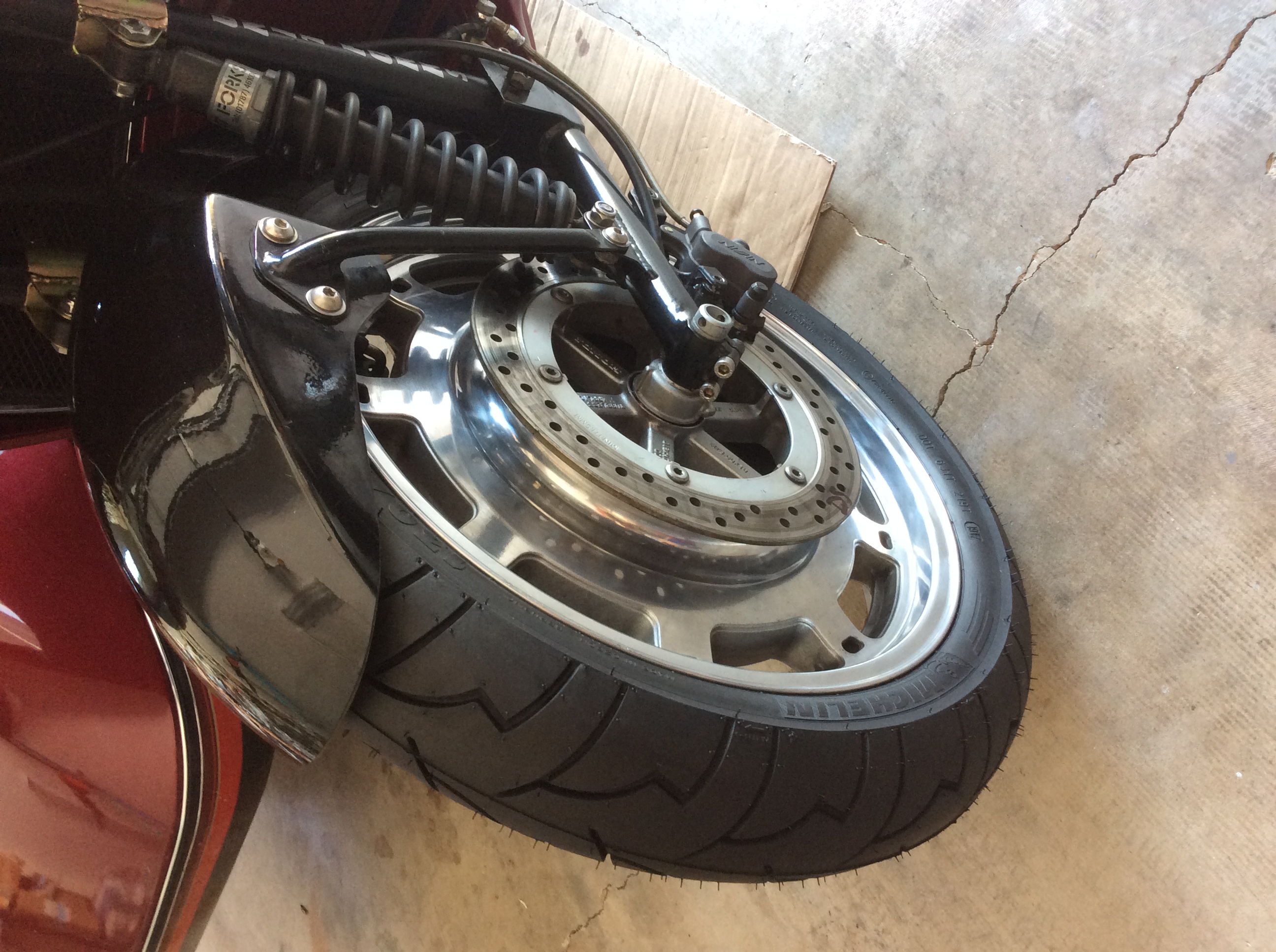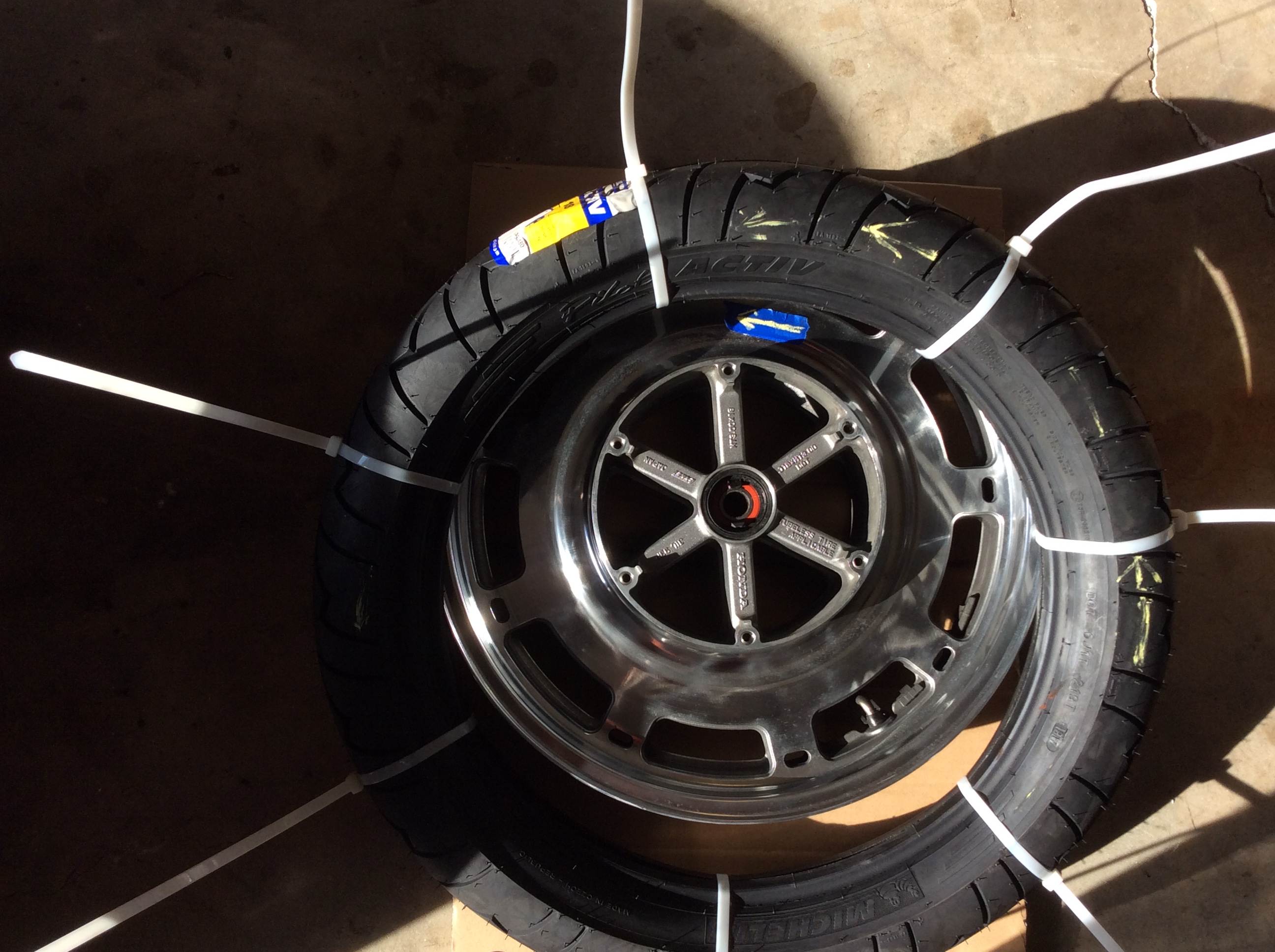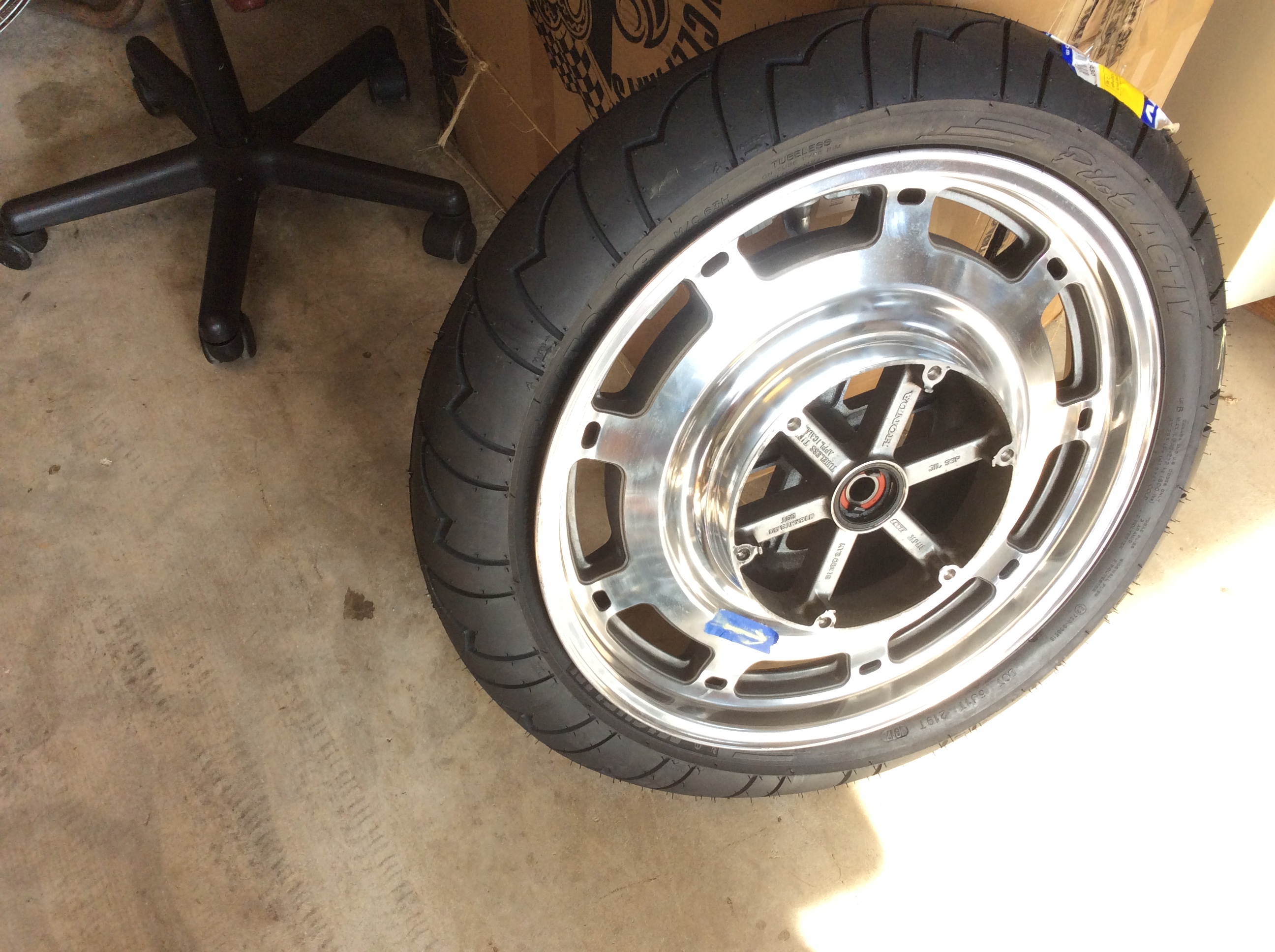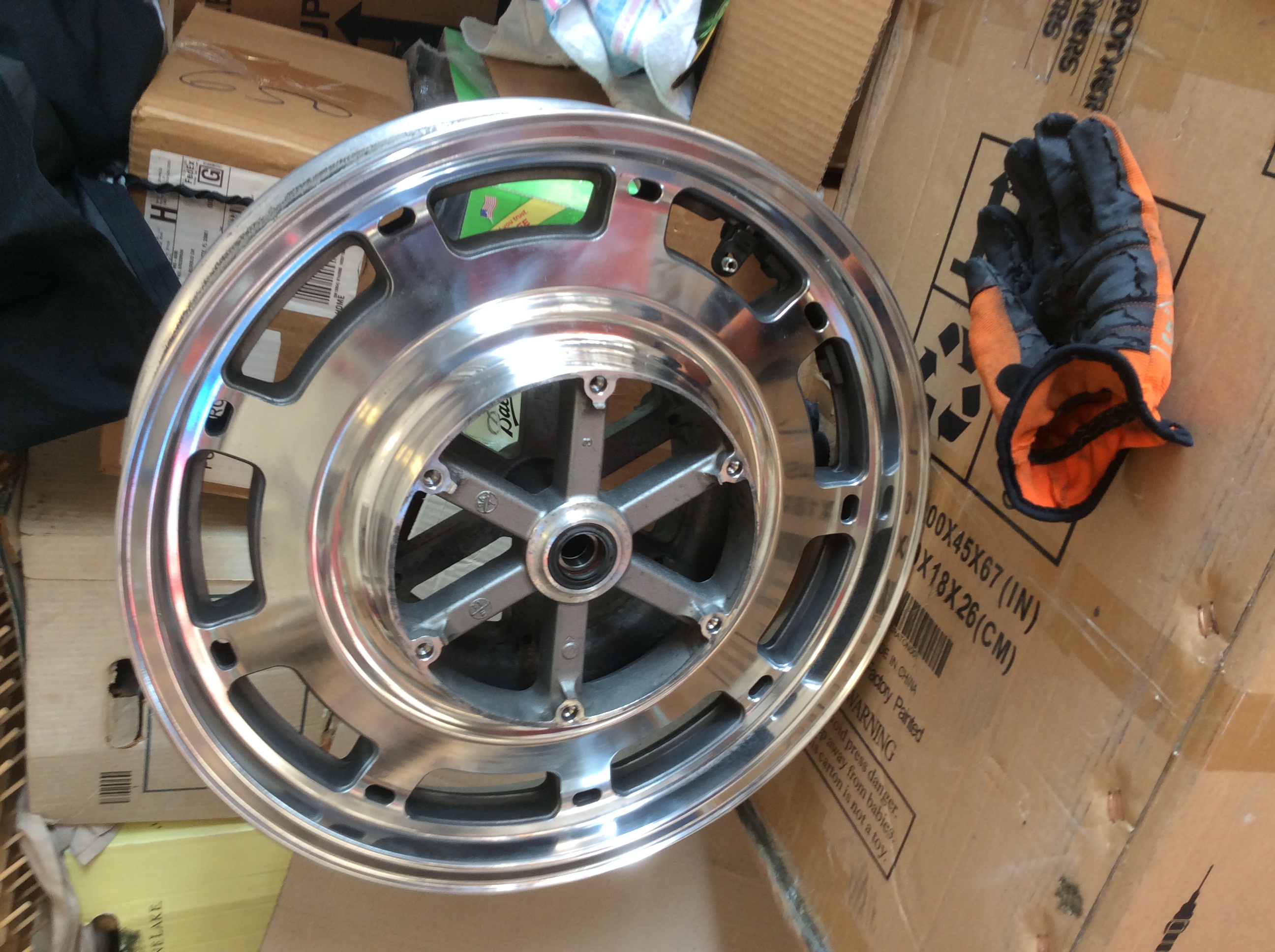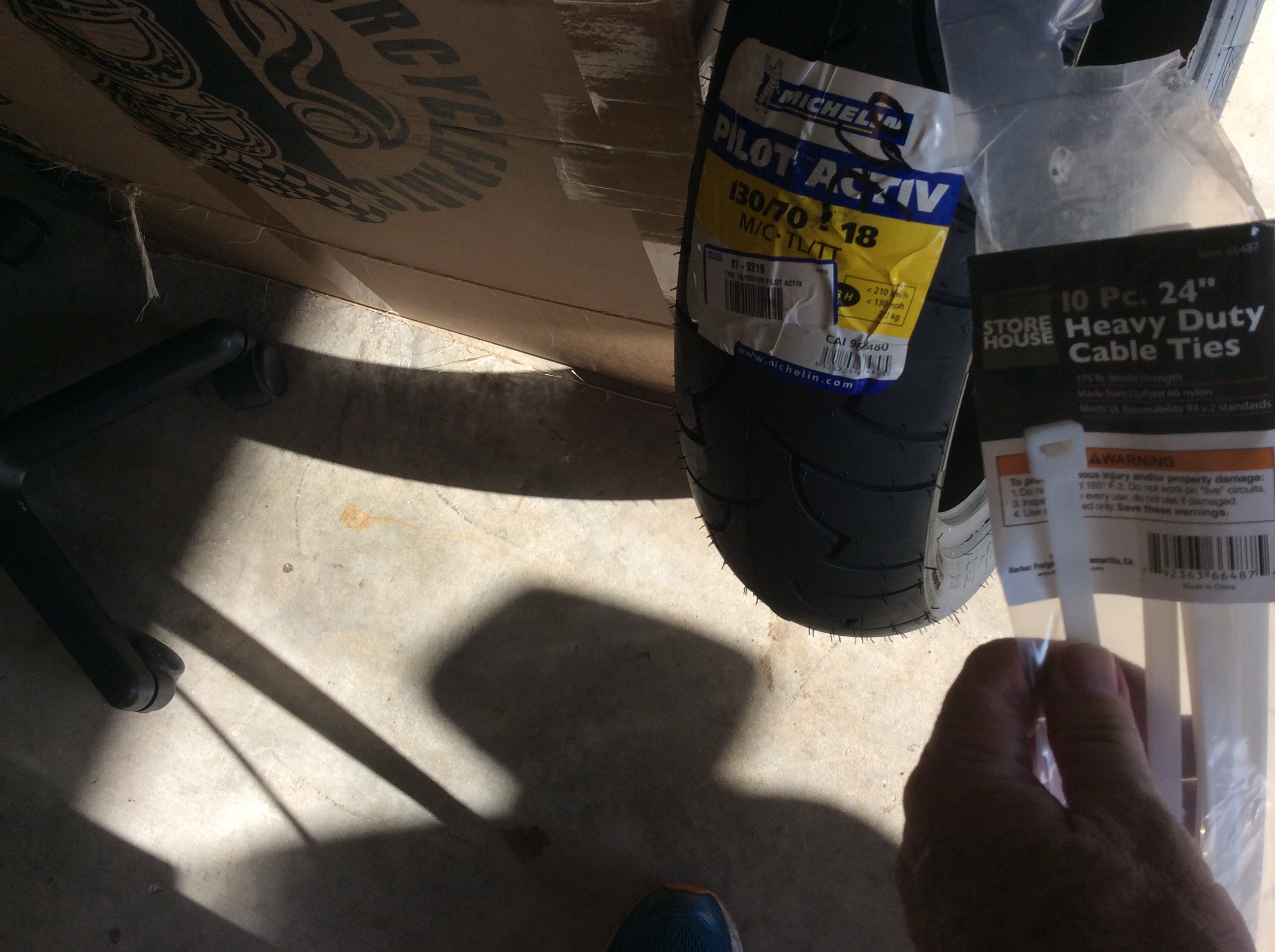 Mounted a new front tire today and decided to polish the wheel for a little "Bling". I mount my tires using zip ties to get it to slide over the rim and I use balance beads in both front and rear. I use 7 24" zip ties and space them around the tire.. cinch them tight as possible. Then I make a dish soap solution ( like DAWN) and spray the tire bead. Next, push the bead over the rim making sure you have the rotation direction correct . I mark mine with tape or chalk so as not to "screw it up". It takes some effort but it will slide on, use more SOAP. Also , if you have a LARGE friend to push it over the bead it helps. If you have too much trouble you can always use a tire spoon or large screwdriver to help get the bead over the rim. Next, add your balance beas by pouring them into the tire before you inflate it. I push down on the bead and dump the correct amount in. (2oz for rear, 1oz for front) You can skip this if you use lead weights or add balance beads thru the valve stem later, but that's a big pain ..Finally inflate the tire to seat the bead then re-install your tire.