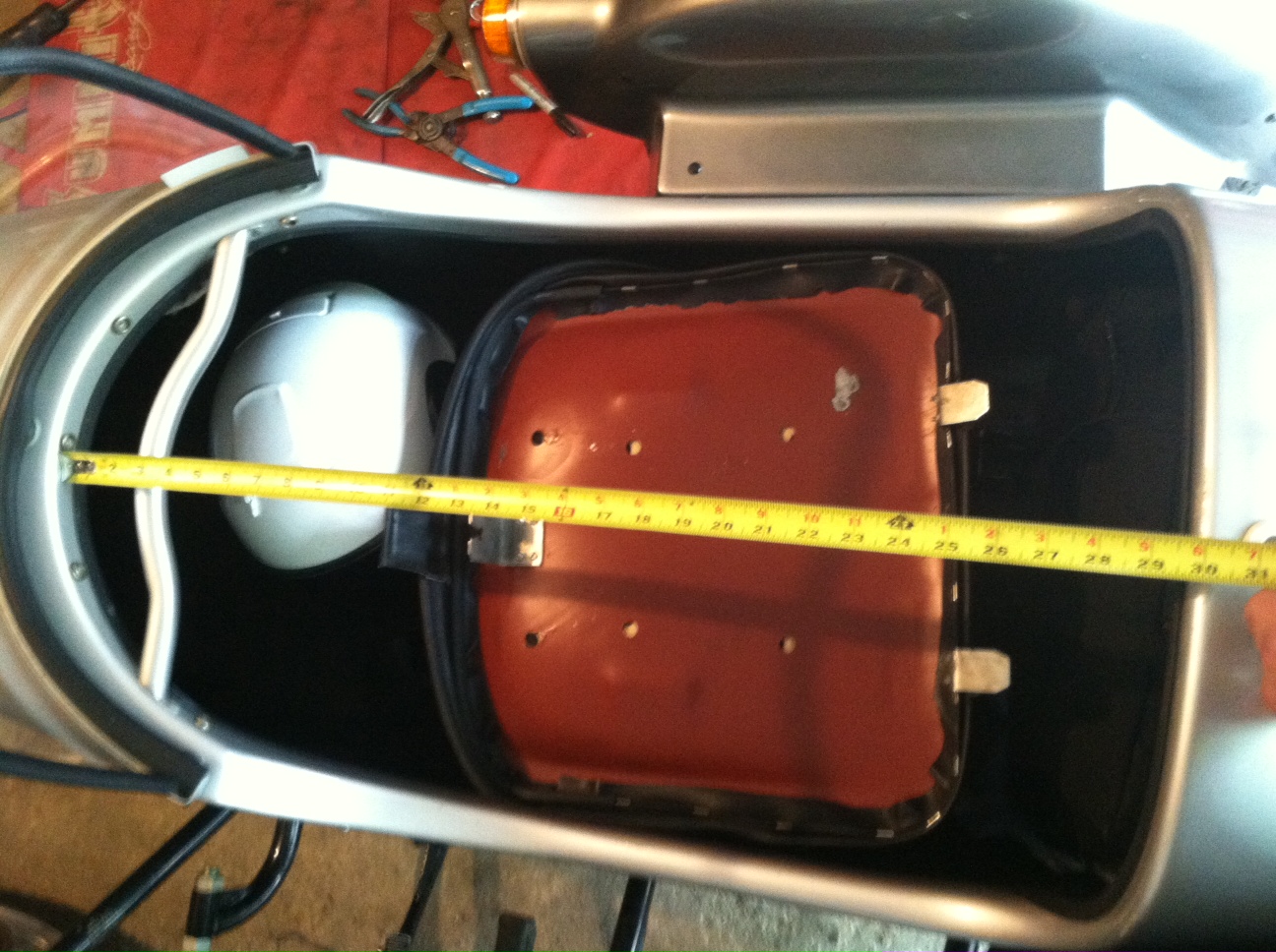 I've added two pictures, one is the measurement from front to back of the "cockpit" with the seat removed. Bad focus, but it is around 29 3/4".