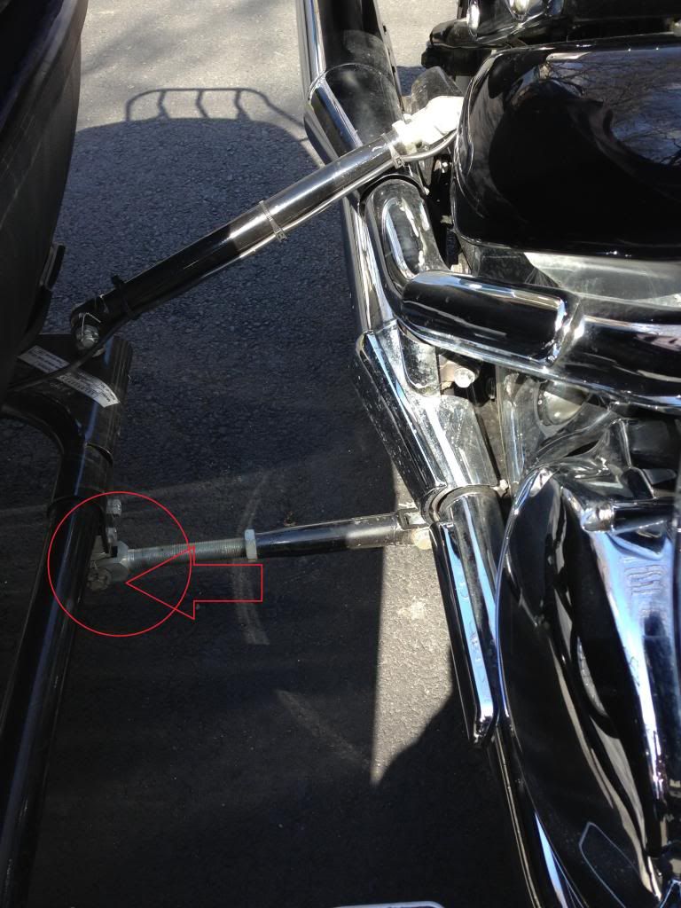 I see lots of problems with this. First, you check lean out at the rear wheel, not the front as with the handle bars even slightly turned it will look completely different. Next, every thing needs to be checked with your weight on the bike. You must have no play in any of the mounting points! Nor should you have any noticeable flex at any of the mounting points. You should be able to shake the bike vigorously and have the sidecar move exactly the same. Next issues are with how it is attached. In general "universal" type mounts seldom work well and as such should be avoided when possible. Looking at photo's your lower rear mount on the sidecar side is set up such that the clamp is trying to resist a twisting motion and as such, odds are great that it will slip in time. I can not see how it attaches on the bike side in the photo's but I suspect that it is also trying to resist a twisting motion. Velorex's concept of having a clamp with an eye bolt going to a clevis on a strut that then has another clevis going to an eye bolt to another clamp is poor engineering at best. You have 4 potential slipping points on the lower rear mount alone. There should be no slipping points. Upper rear mount is attached well at the sidecar however it could stand to be a lot higher on the bike frame for better triangulation. Again I can not tell how the upper rear mount attaches to the bike. If it is a frame clamp it should be installed such that it can not rotate. Our mount here picks up both of the two bolts just above this mount. I can not tell how the front mounts are attached but it would appear that you have way to much wheel lead on this bike caused by the need to place the front lower mount in correctly as the only adjustment Velorex has for wheel lead is clamp placement. Your upper struts are also up side down. The threaded part should be down so that water does not over time run down the threads and cause them to rust in place. Here is a link showing a better way to mount a Velorex sidecar http://www.dmcsidecars.com/the-result-of-improper-sidecar-mounting-and-the-proper-fix/ Attached you will also find alignment instructions as well as photo's of what our mounts look like.