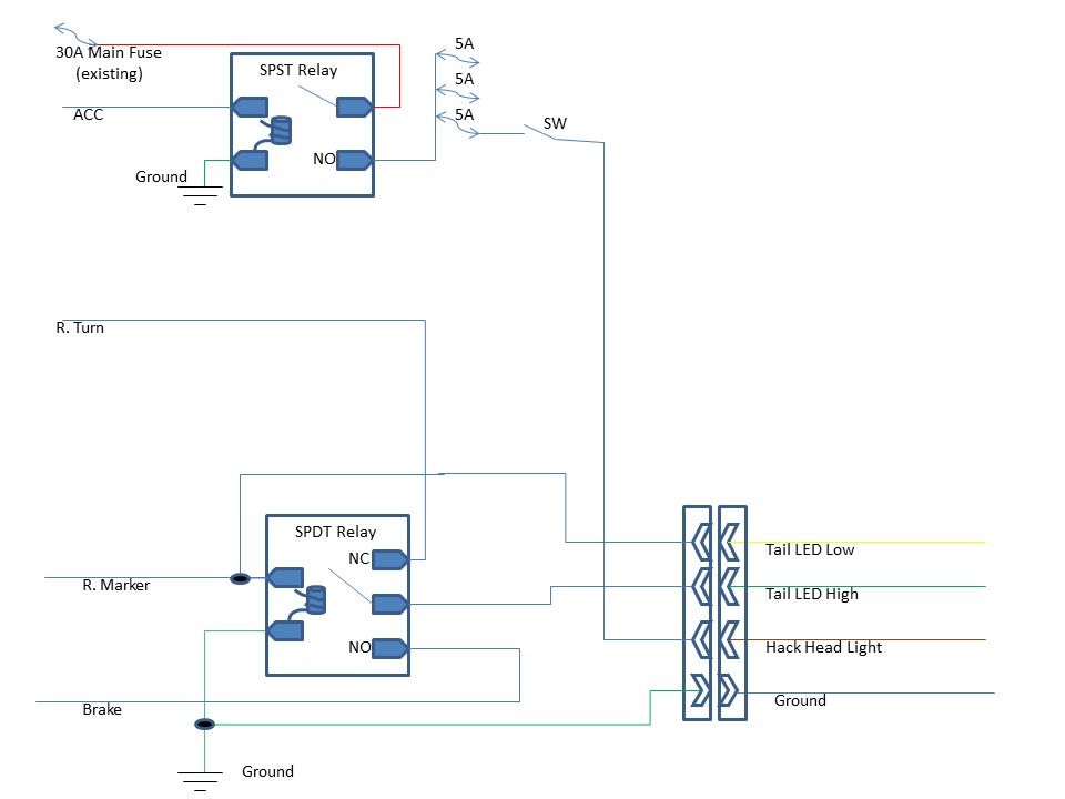 The bottom relay triggers off the right side marker light (R.marker) circuit. The marker light is normally energized unless the right turn (R.turn) signal is on. So, with (R.turn) off, (R.marker) is on, pulling the relay closed. With the relay closed, (Brake) is passed thru to (Tail LED High). When (R.turn) is activated, (R.marker) and thus the relay, is off. The relay then passes (R.Turn) to (Tail LED High). I use a trailer-type flat-four wire connector as a quick connect. That's what the two rectangles on the right with all the chevrons is supposed to be.