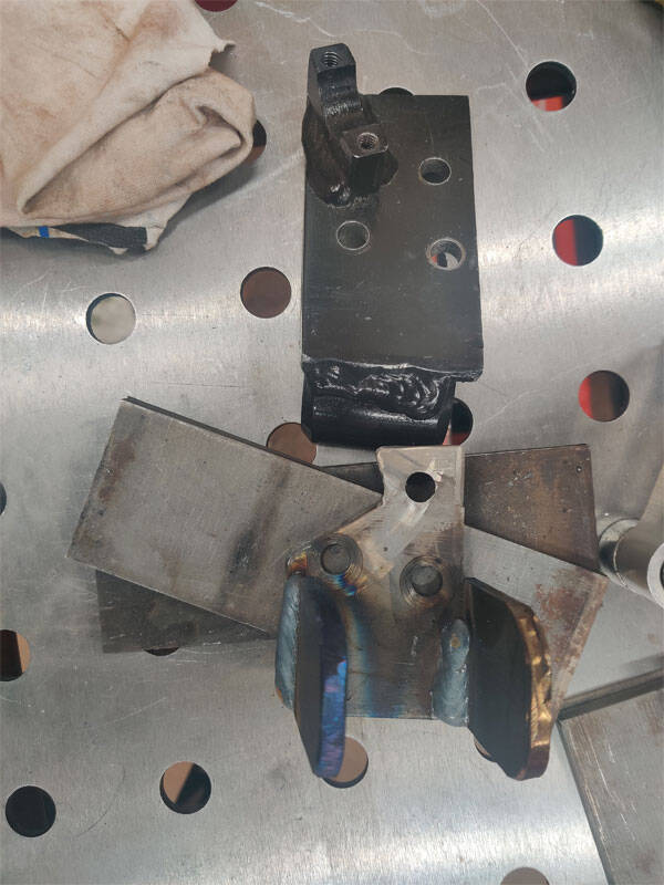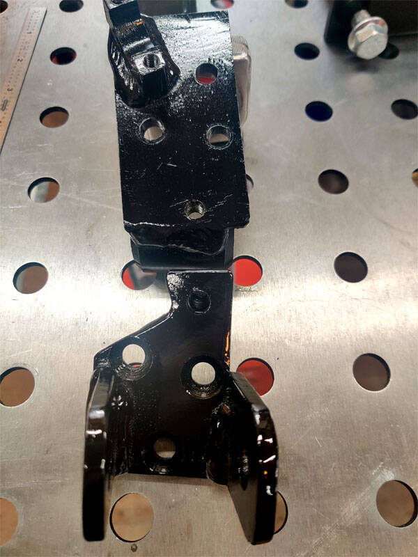 Back to work on the front lower mount. This will have a sub-bracket that stays with the sidecar (unpainted piece), and bolts to the bracket that stays on the bike (painted piece).
