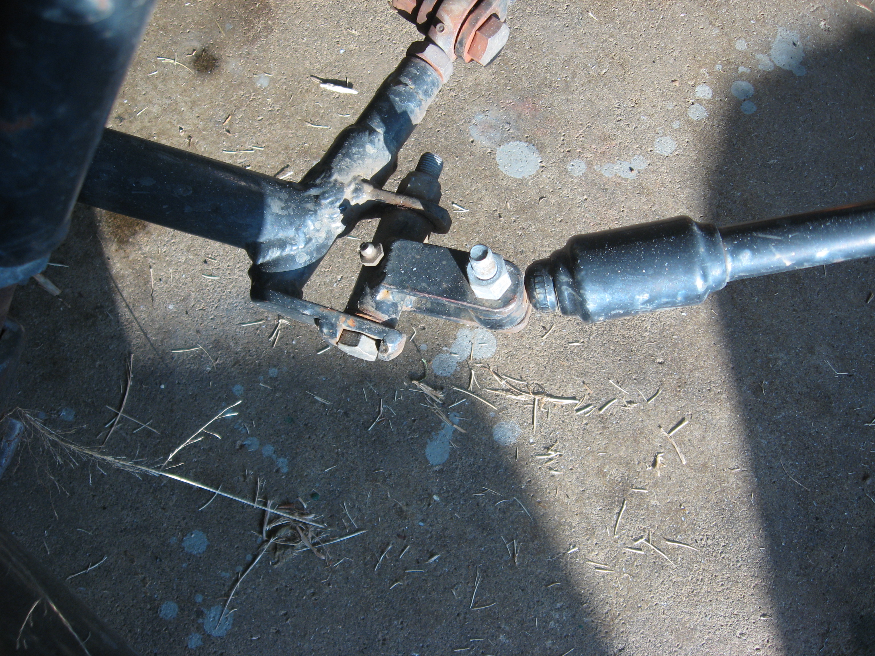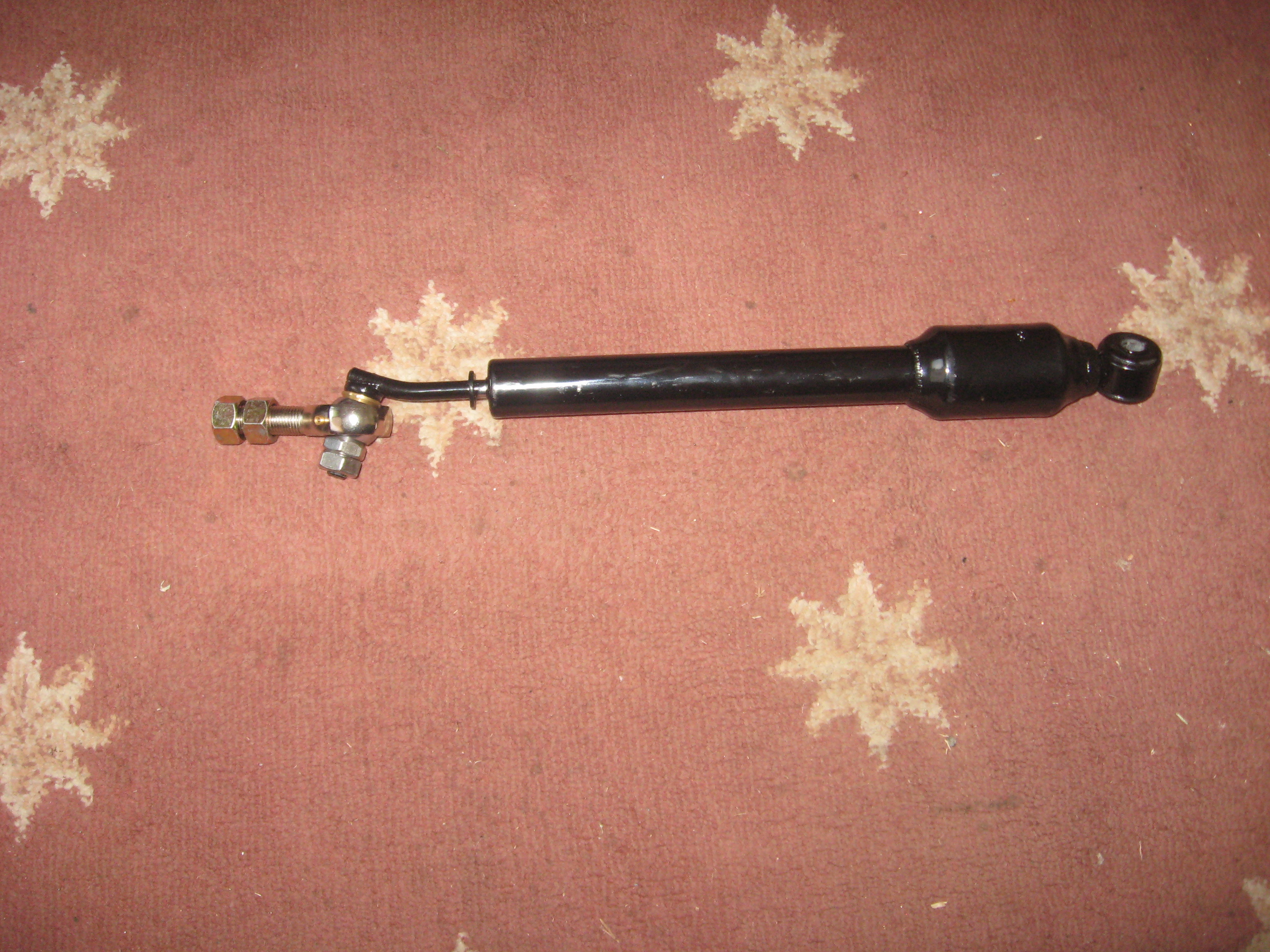 At the other end of the shock is a home made universal joint that is a piece of 1 inch rod drilled to 10 mm through its center. tabs are welded to it and drilled to accept a ten mm bolt that holds the big end of the shock.