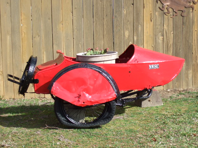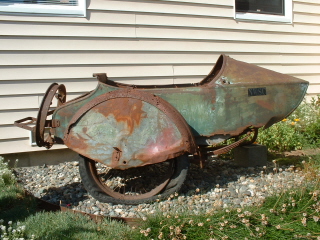 My old sidecar was obtained from a client who wanted me to restore it so he could install it on a 1924 Harley. It had two trees growing up through it and was too far gone from rust so I swapped some H-D parts for it and used it for the shop Mascot. It's the only sidecar here that's not for sale.