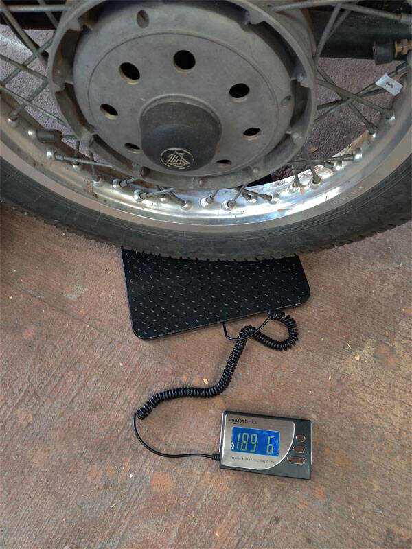 Took a bit of time out from working on the broken down farm hobble to weigh the rig today. Just the rig with a full tank of fuel, empty panniers and the scissor jack in the trunk. 319 lbs 12 ozs on the front tire. 394 lbs 12 ozs on the rear tire. 189 lbs 6 ozs on the sidecar (no ballast weight). Just a touch over 904 lbs (give or take 2 lbs scale accuracy).