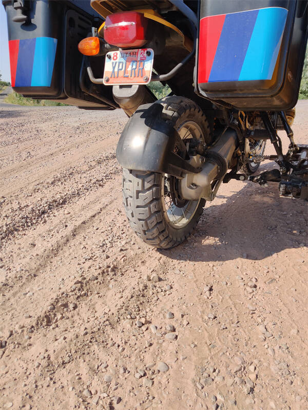 We are fortunate to have some really nice maintained gravel/dirt roads for all the oil wells, so the ride started with a quick trip on a dirt road to get the rig drifting and power sliding. Get some of the oils out of the tires, and rough up the tread a bit. Then took the bike on some nice smooth back roads & freeway up to 65mph in stages. 40mph for a few miles, 50 mph for a few miles, 60 mph for a few miles, and finally 65 mph for about 5 miles. Feeling for any vibrations. Nothing noticed through the seat, pegs, knees squeezed against the tank, holding onto the pannier rack loosely with a hand. One thing of note is how crazy quiet they are. I was not expecting that. Will be interested to see how that lasts over the life of the tires.