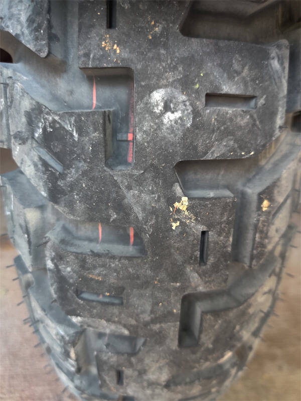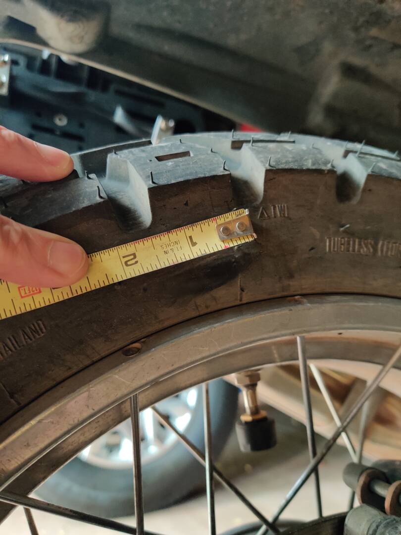 Back in the garage, I got a good look at the tires. some slight edge rounding on the front and rear, but no slicing, tearing or chunking. I was pretty aggressive on the ride up with the power. On the way down I did multiple max front brake deployments in the nasty rock sections. Well as "max" as I could with ABS (forgot how to turn it off... lol).