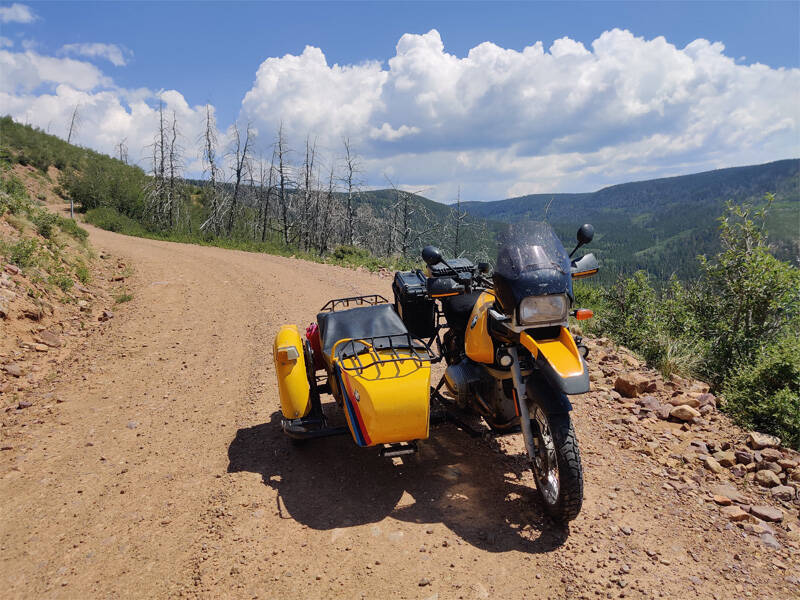 Decided to try the short off-road test track loop, and almost flipped the rig. That was a bit spooky. Off camber with sidecar up top. Side car tire hit a rock and bounced up past the tipping point. Was able to steer off the trail & down the hill, which created some other issues. But eventually was able to get back on the trail. This time I got the bike going, and put most my weight in the sidecar tub. The other leg on the bike seat. Kind of sketchy, but got me out of the mess.