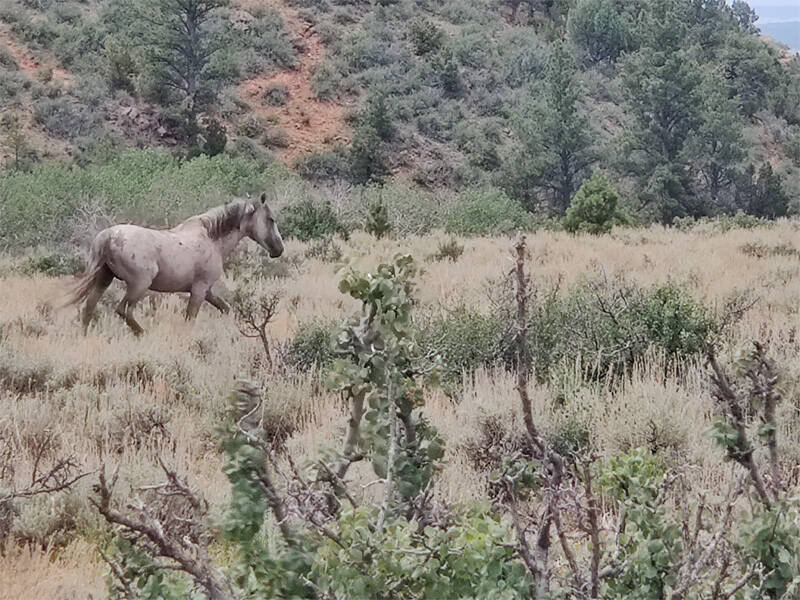 Rolled the rock out of the way, got back on the track, and did a damage assessment. No damage at all to the rig. Some scrub brush was manicured, but that was it. Back on the trail, come around a corner and see this beautiful gal. From the size of her head, she's a Mustang, but taller than most I've seen, and looking very healthy. I stopped shut off the engine to see what she'd do. Settled back to a mid morning snack-out. Wary, but not interested in investigating.