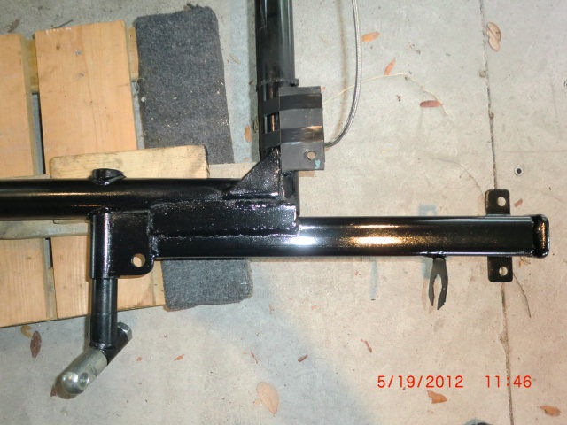 I got a 6' section of 2x2 tube, planning to mount it on the lower sidecar to bike mounts. Turned out it interfered with the brake pedal. Tried it under the mounts, too low. Cut it down to 19" and welded it to the sidecar frame, problem solved. Used a 1 1/4" receiver insert and a 5" rise ball mount.