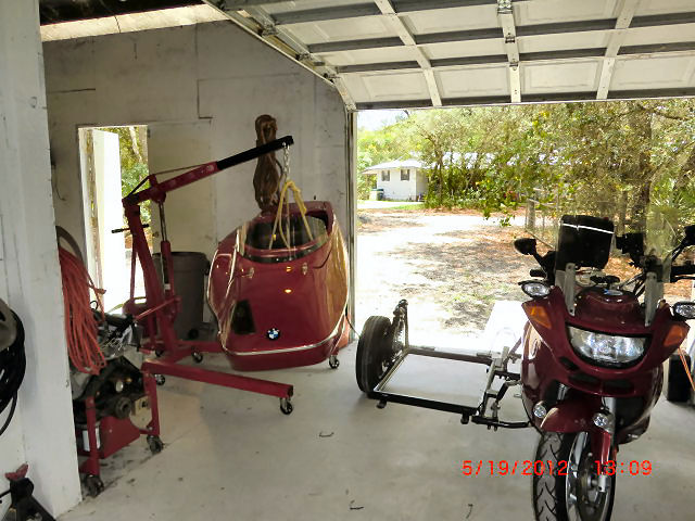 Oh, and how do you remove/install the body alone? Shop crane does the lifting and serves as a dolly to move it around. Car body rests on the support legs. I used a sling under the seat to lift with.