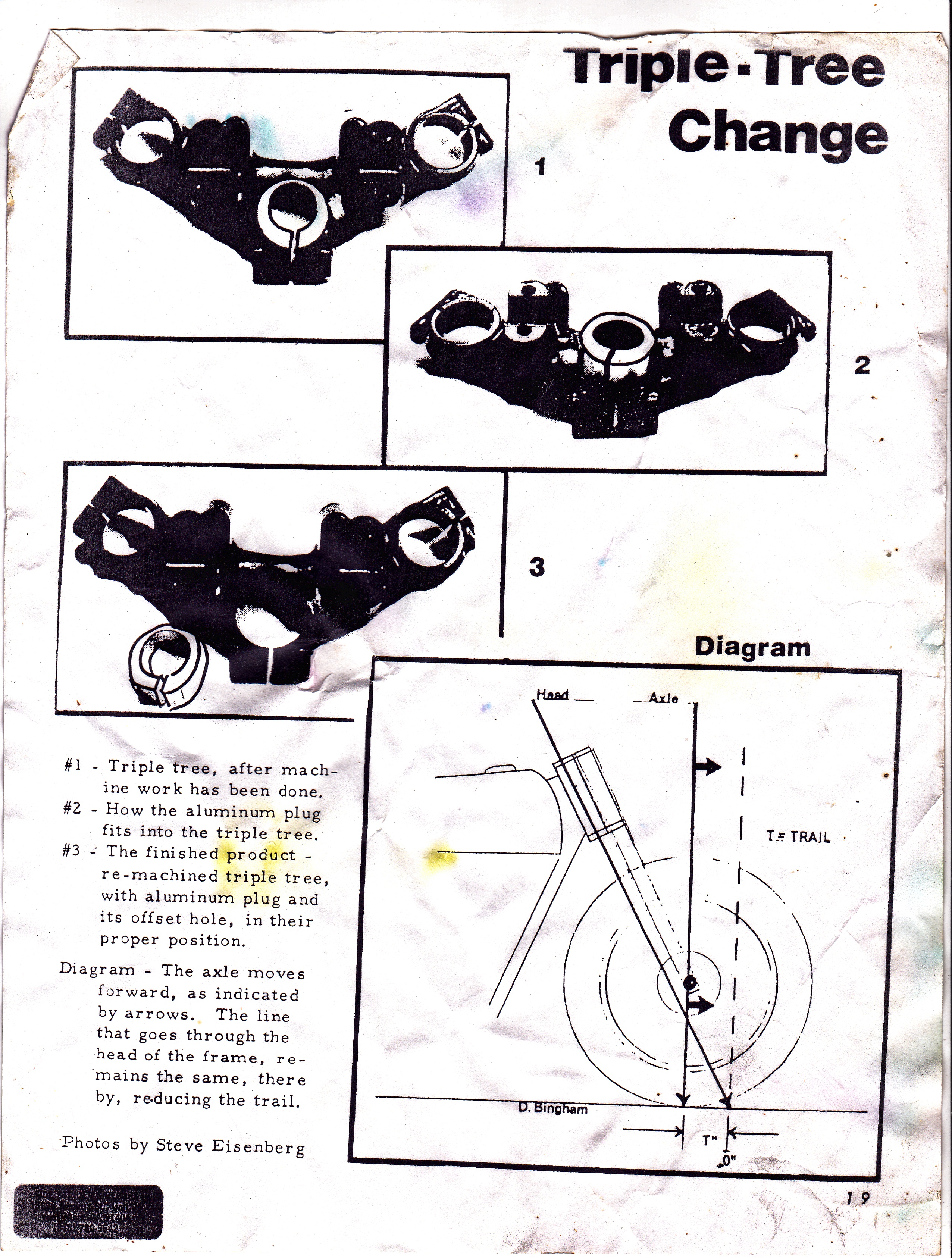 Have done this a few times--but have always gotten confused. it always appears at first look, that this modification will bring the front wheel (axle)closer to the frame, rather than farther, but you're actually moving the triple tree rearward, increasing the rake of the front forks,moving the wheel (axle) away from the frame, thereby decreasing trail?