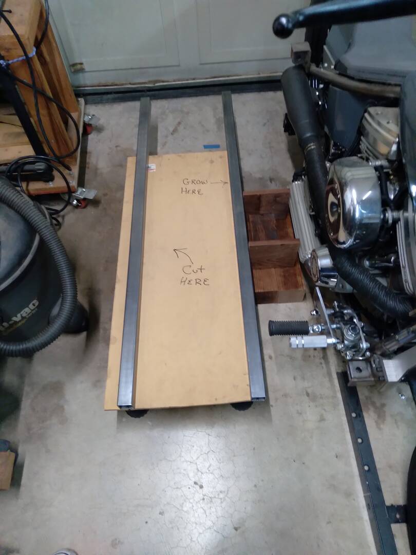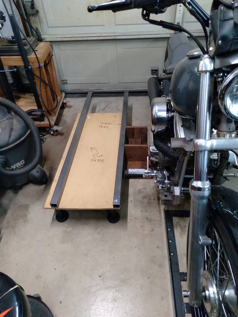 Some progress. Moved stuff around the garage to make room to build this, parked the bike in its spot and got it secured and level. Cleaned and inspected the new steel, deburred the ends and made a cut list. Also made the spacer that helps me keep the chassis parallel to the bike, and set the lower mount locations.