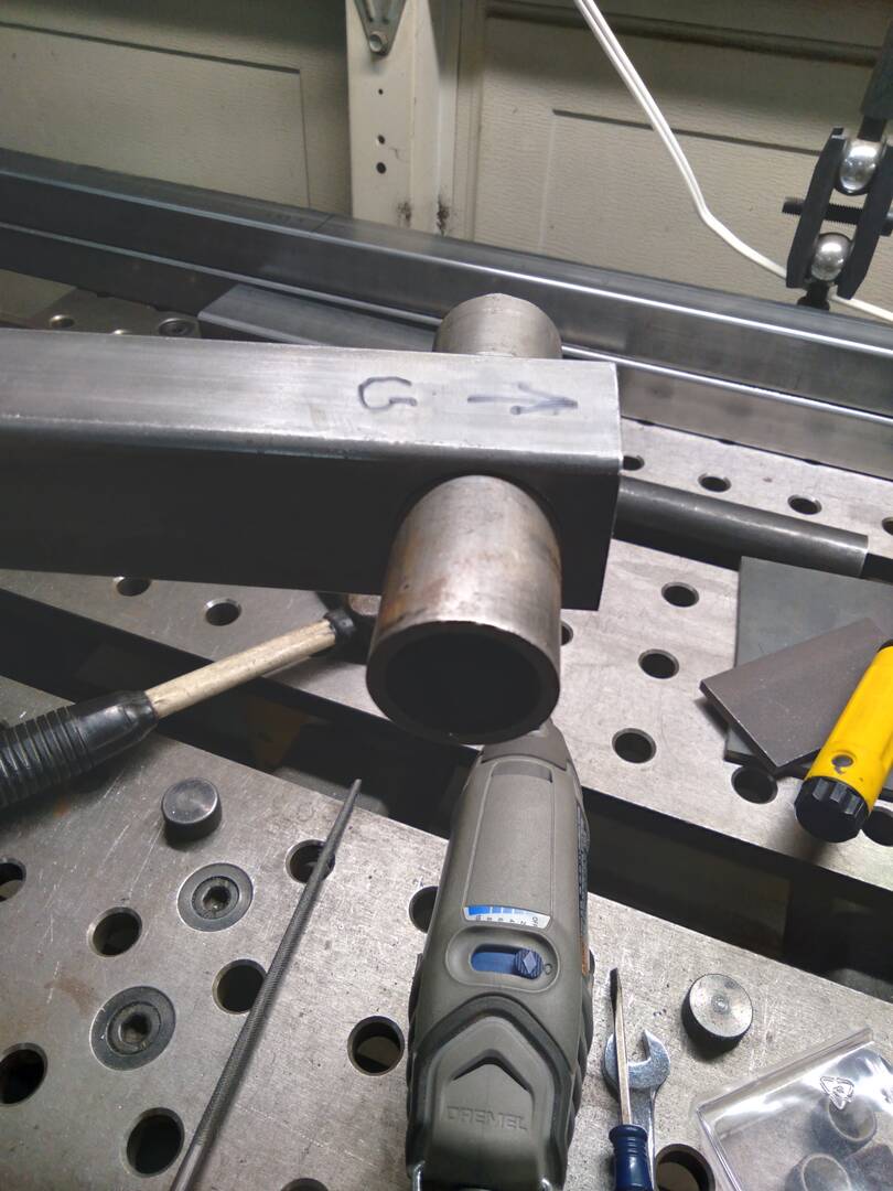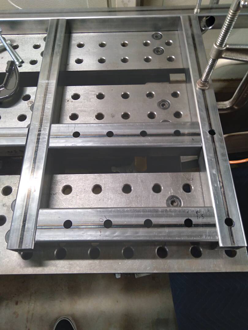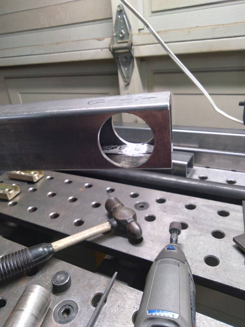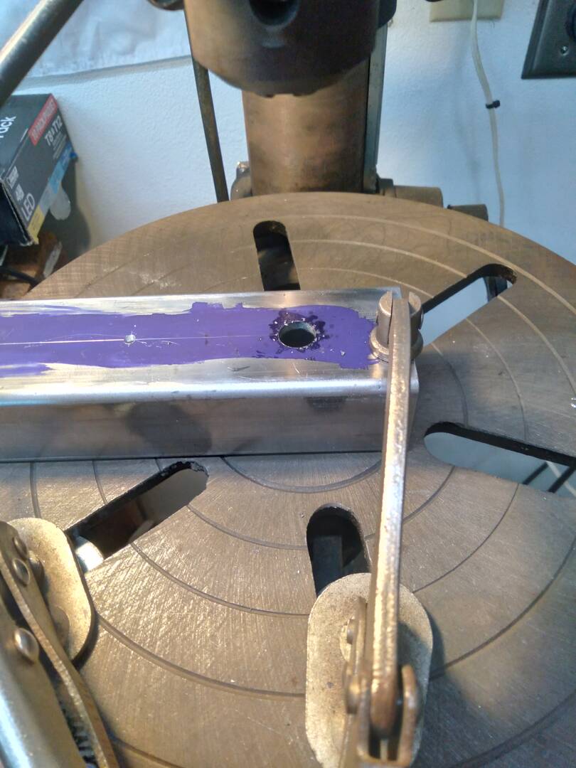 Anyway, I got all the holes done for the axle block, the ten through holes give me three possible lead positions. The chassis is actually upside down here, the weld seam of the tubing won't allow it to sit flat, so it will get tacked together while jigged upside down first.