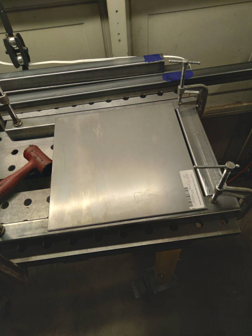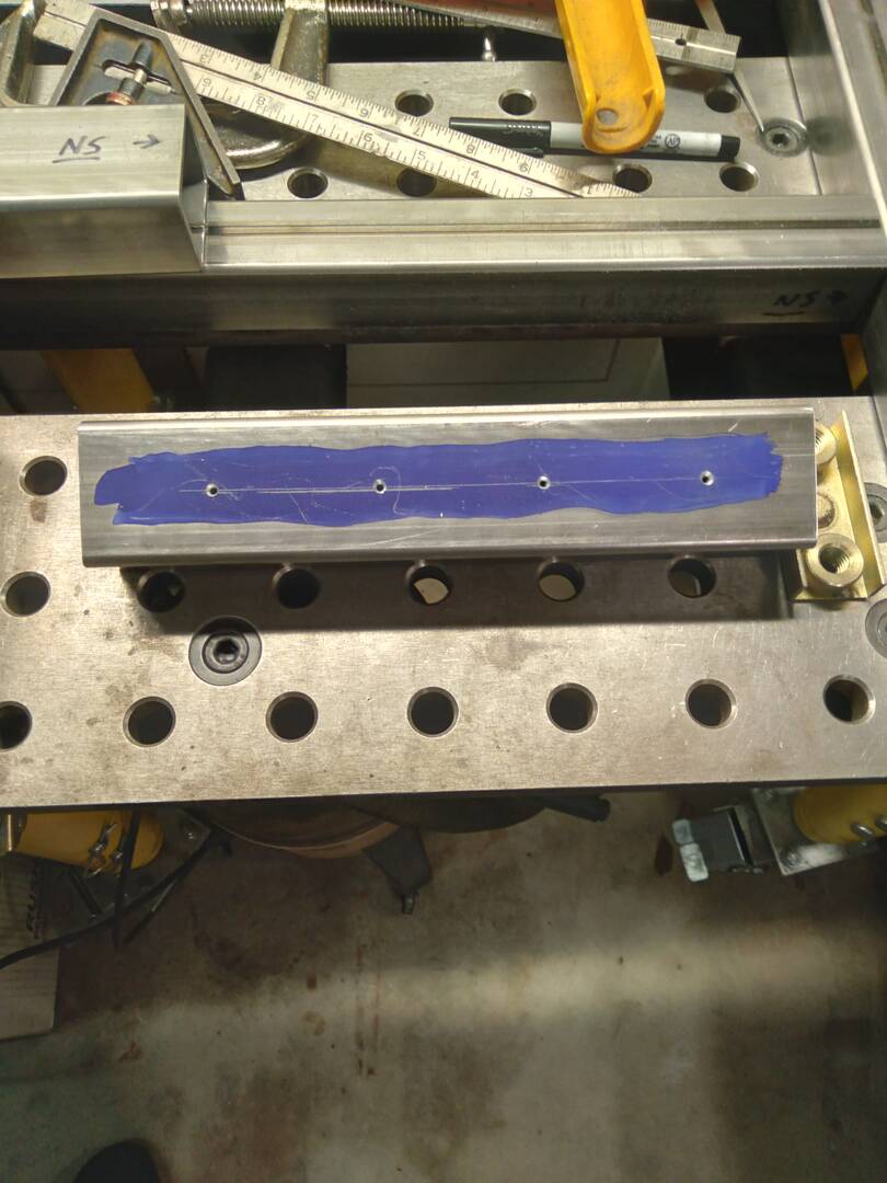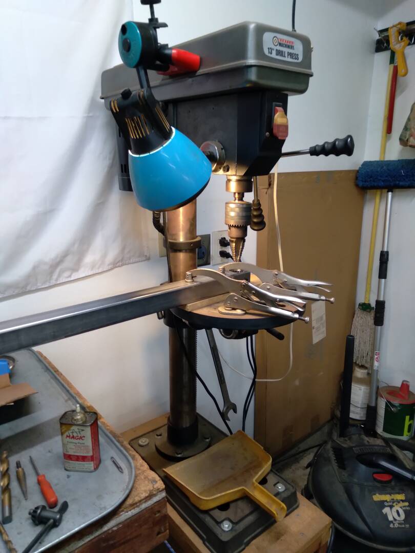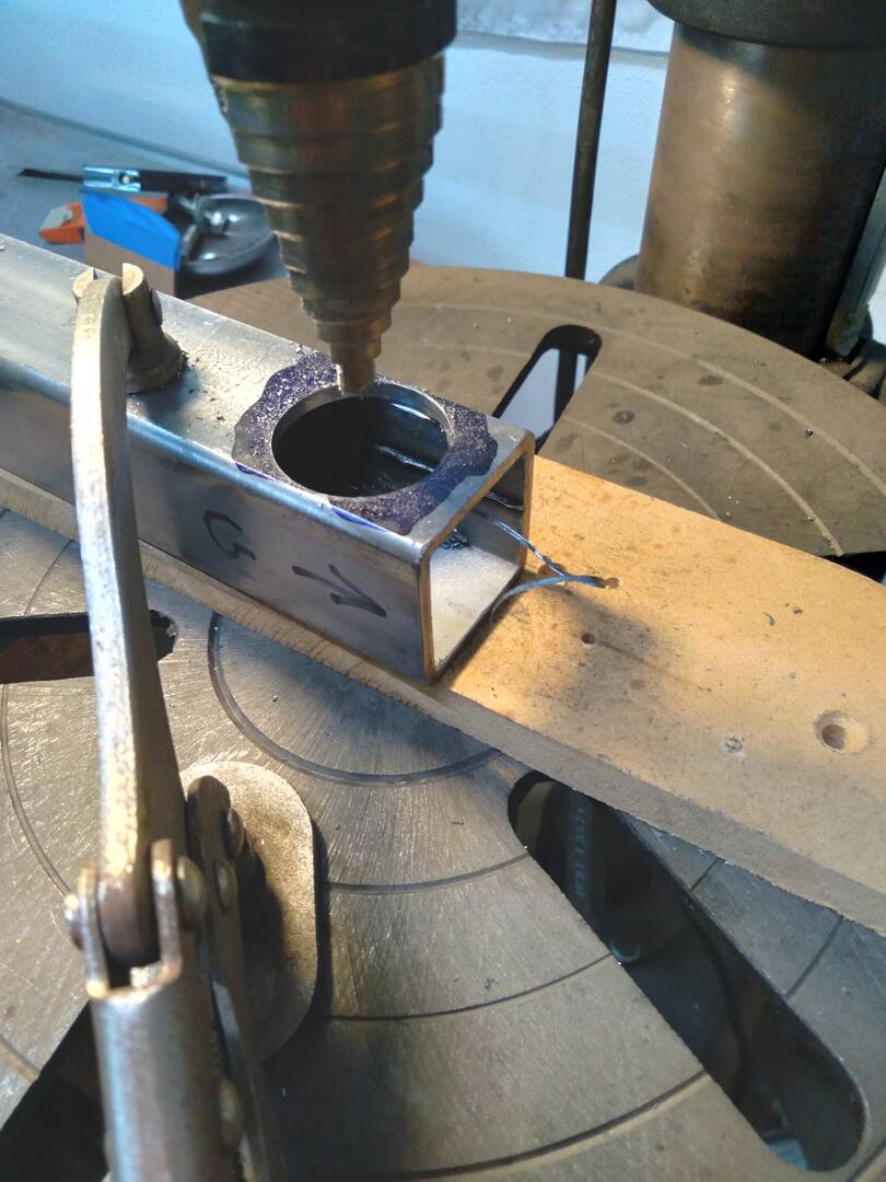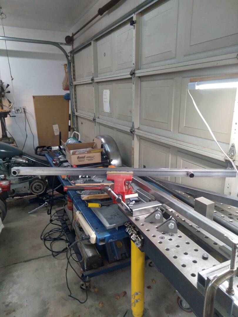 Anyway, I got all the holes done for the axle block, the ten through holes give me three possible lead positions. The chassis is actually upside down here, the weld seam of the tubing won't allow it to sit flat, so it will get tacked together while jigged upside down first.