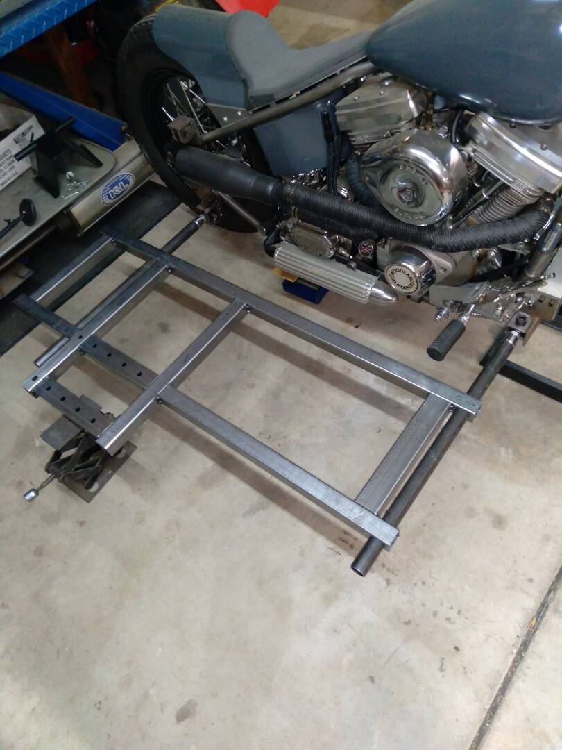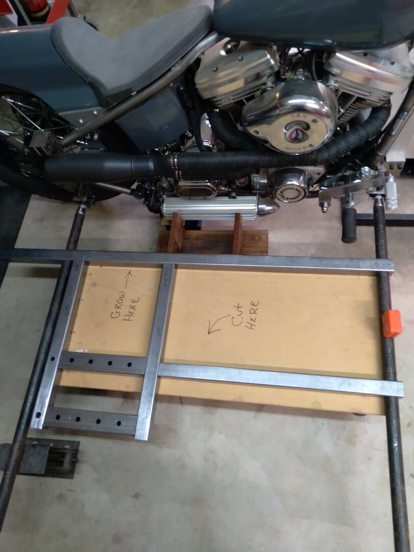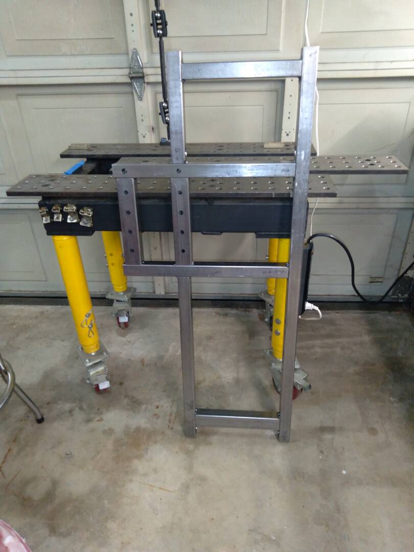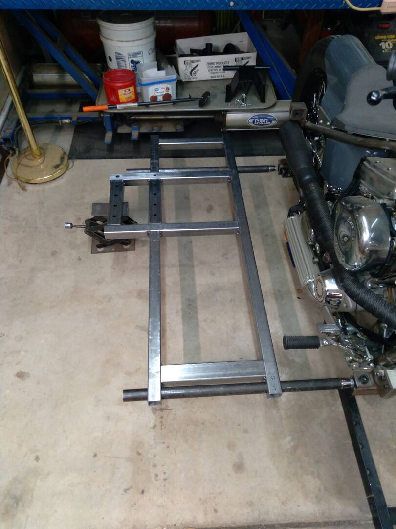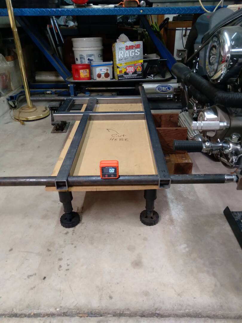 The chassis is back on the table. Finishing up the last pieces for it, and, as always, I made some changes to the design. The front crossmember is now from rectangle stock, the rear is 6.5 inches longer than the original chassis, and a rear crossmember has been added. Due to the increased length, I had to push the "GROW" button on my little table.