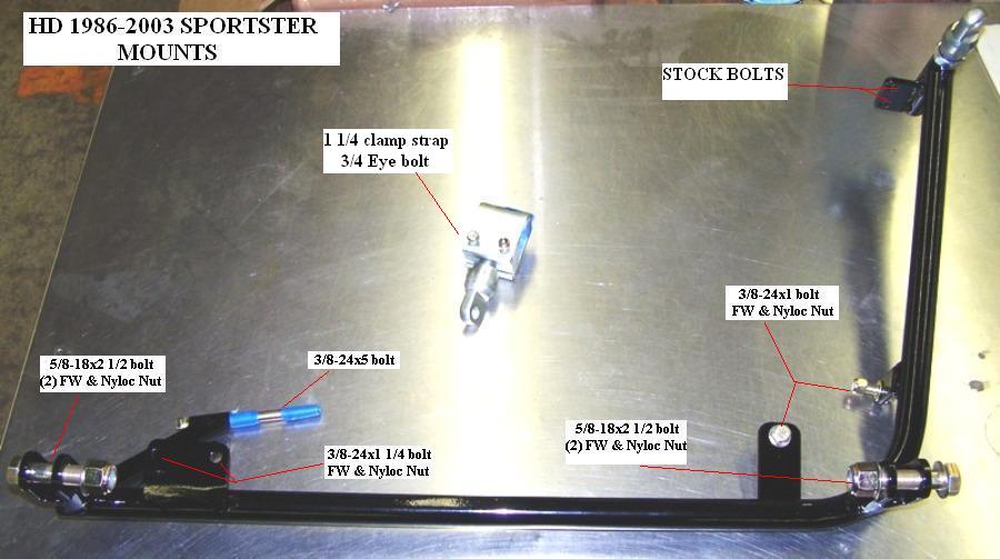 Here is what our sub frame looks like for the 1986 to 2003 Sportster, as you will see the lower mounts are equal distance from the ground and the lower rear is quite a bit further aft then the main frame of the bike.