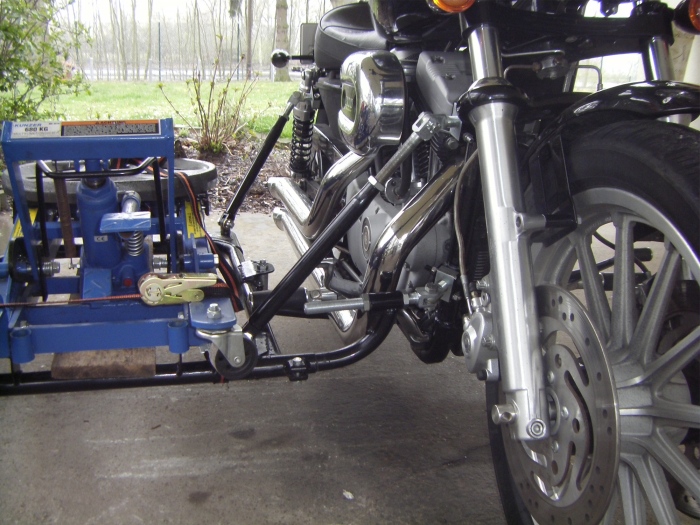 As Iam sure others will tell you' the further foward you have the hack wheel the more stable it will be-but will also be harder to steer. On my 85fxrvelorex I used a piece of2x2 by44 inch long 3/16 sq. tubing bolted atop the velos frame tube using 9/16s bolts up thru the velos2 upper strut holes along with 2 4inch by 1/4 inch-u clamps that are around the velos tube and straddle and are bolted thru the 2 inch tube. This will allow you to drill location holes for your struts where you need them and allow you to shift the hack back for a more favorable wheel lead. Hope this helps. Need more info? email me and we'll see what we can do HD Hank