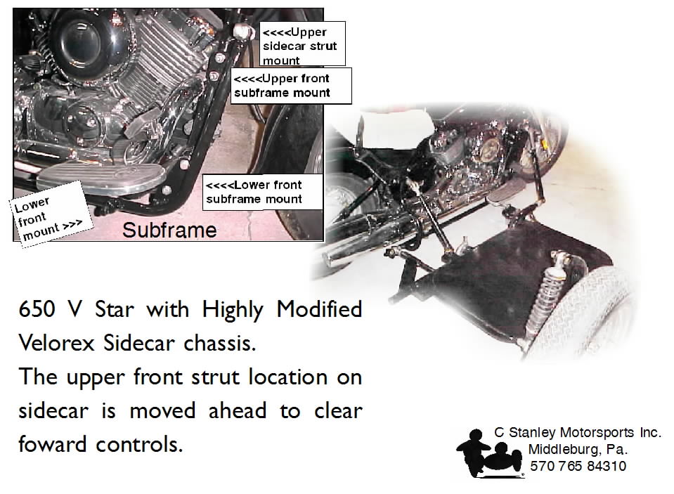 This Velorex is probably a little more modified than you intend to do but it does show the front upper mount attachemnt point on the sidecar frame after it was moved.