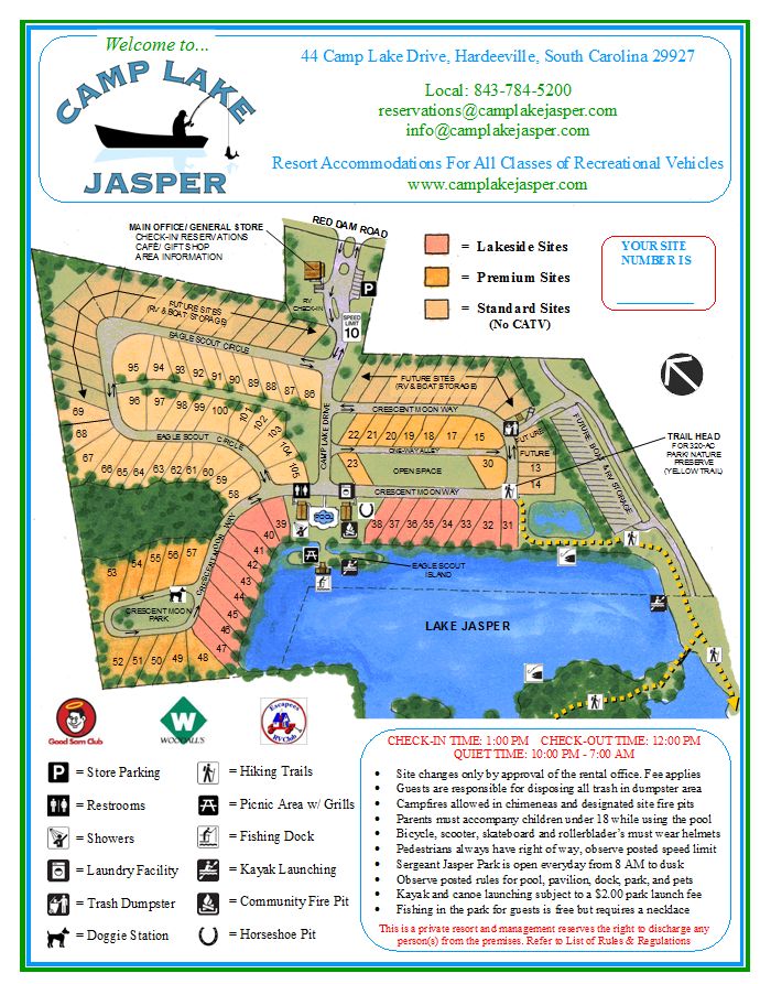 Here is my report, I can`t send floor plan but go on web site .We will set up tent 30x50ft on vacant space between sites #3-30 and on the rest of this 300 ft section will be space for tent campers . This is across from both restrooms &laundry bldg. The 29 site around this section will be blocked off for USCA with another 10/12 across if we need .all these sites are full hook-up some pull thru &some back-in .all are very long. They have 30/50 amp electric Wi-Fi & cable TV. The lake front will be $35 &pull through $30. Be sure to state you are USCA when registering to get these rates .the tent site are $10. At this time I am still shopping restaurants but have 3 ea. so far @ $7-8 rate. I am still looking to find an outfit to do Low Country Boil & Mark is also working on that. This location is very good & much better than the first it has almost constant breeze blowing off lake or up from ocean east of us. Do to him saving so many sites he would like early registration & full payment by end of May. We will need work group to help set up tables & chairs in tent Menu choices are China, Mexican bar-b-q, & chicken for sat night. There is Dunlin Donuts close by for Sunday morning. I will have Hobo stew for Thurs. night. I will also need numbers a.s.a.p. as tables & tent size changes the prices.