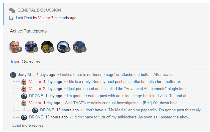 Another nice feature. This topic "Can't add images" has been pretty popular, it has a lot of posts (although they have wandered but that's ok for now). Check this out. At the top of the page there is a status bar on the top right. Click on the little down arrow. It shows a summary of all the various posts with their first lines and an indicator of all the participants and how many posts they have made. Nice!
