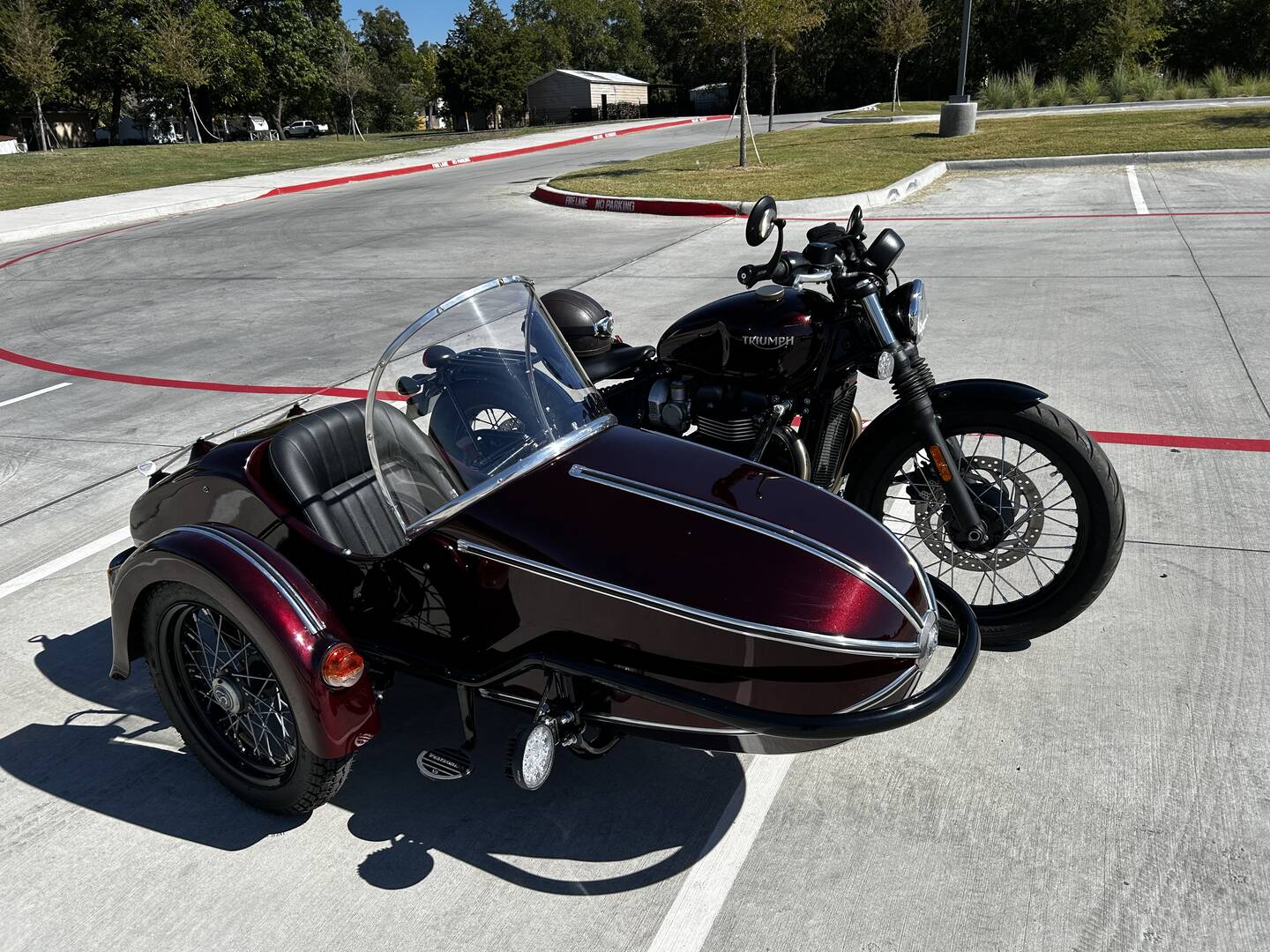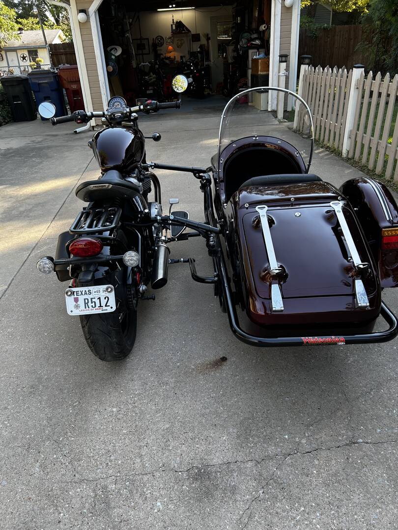 ‘Hope these pictures post. This is my new rig, namely a Triumph Bobber and Watsonian sidecar. Texas Sidecar Company rescued this rig and got it painted and together in six month due to his other customers ahead on me. Many thanks to James Screiber, a fellow Marine and USCA member, who subsequently drove 50 miles to visit me twice, and correct my tire rubbing against the fender by grinding bolts sticking out from the turn signal assembly. I’m now out every day getting familiar with the rig, and reading Driving a Sidecar Rig and teaching myself.
