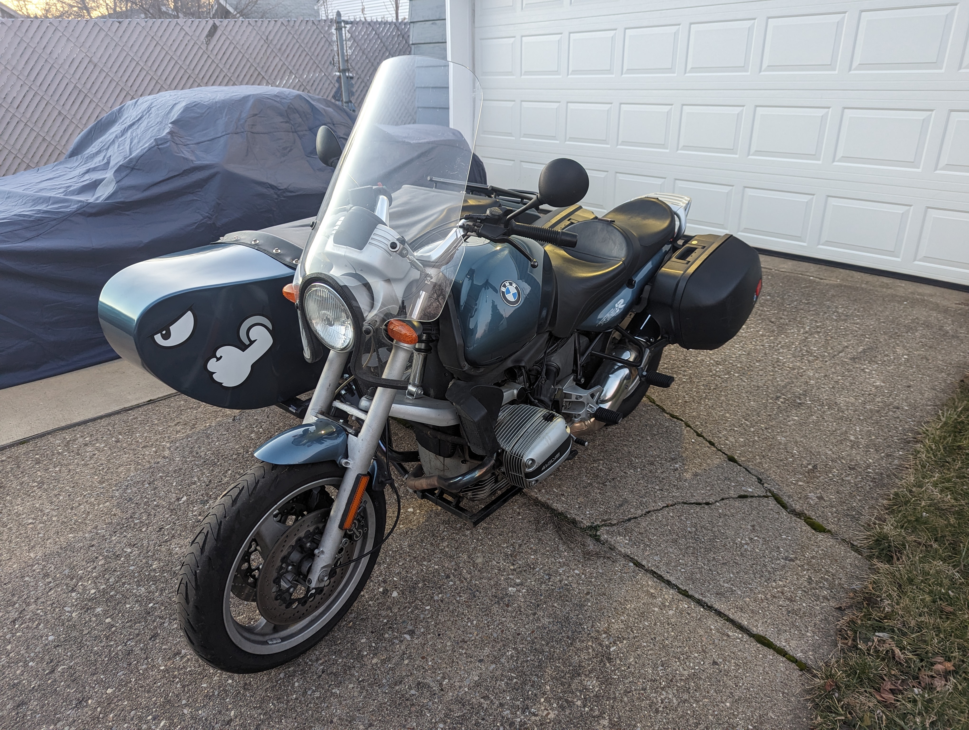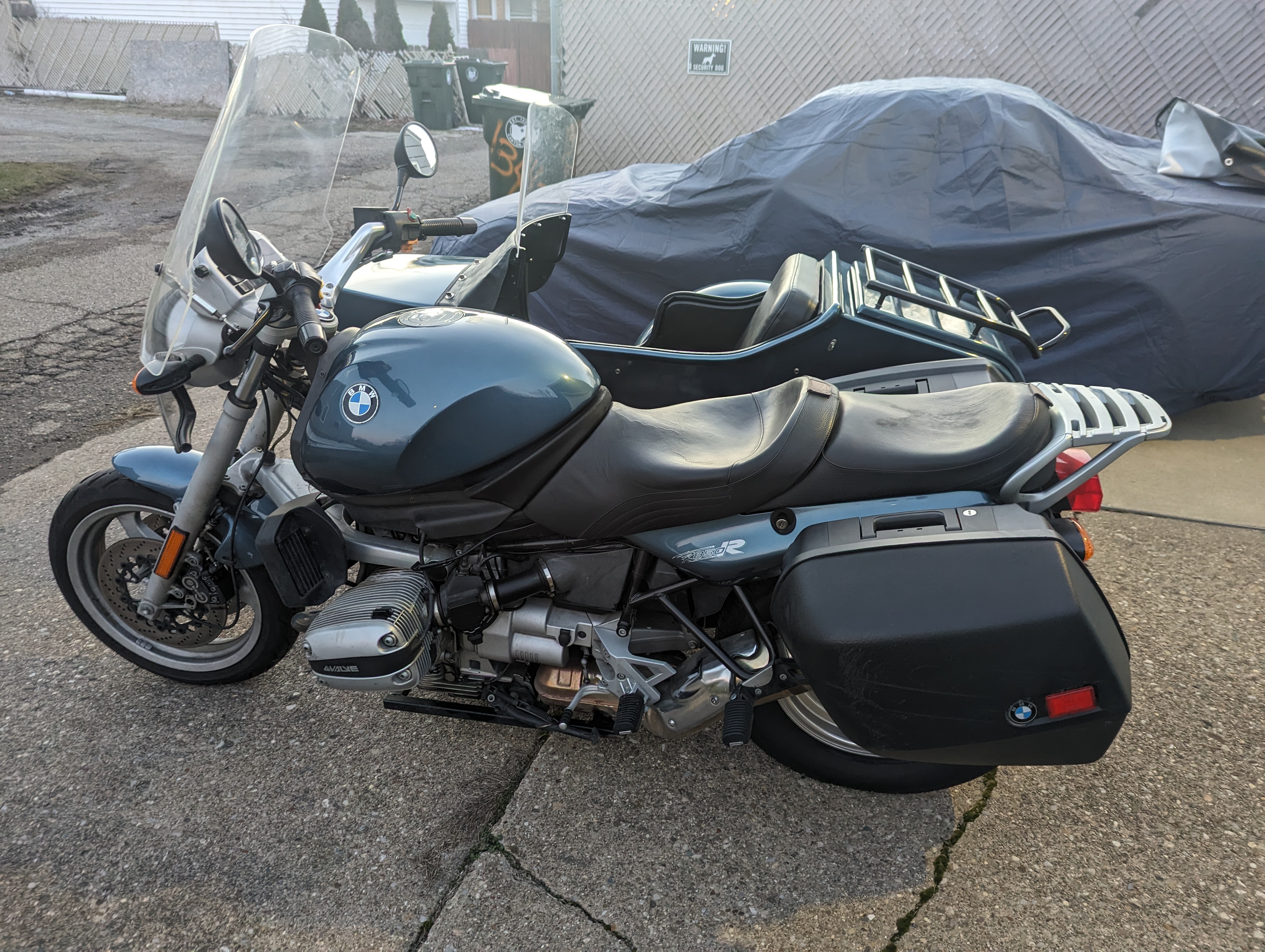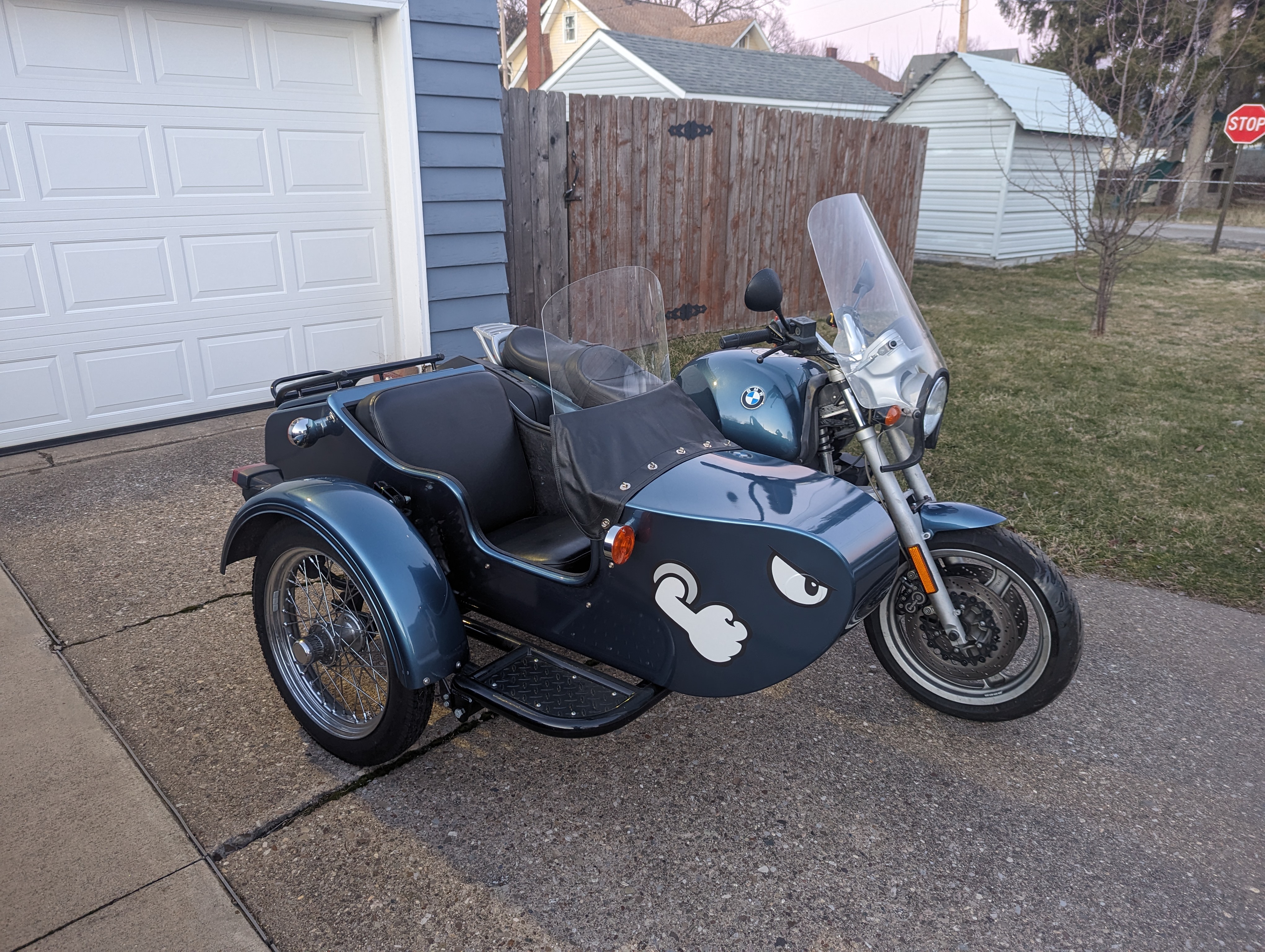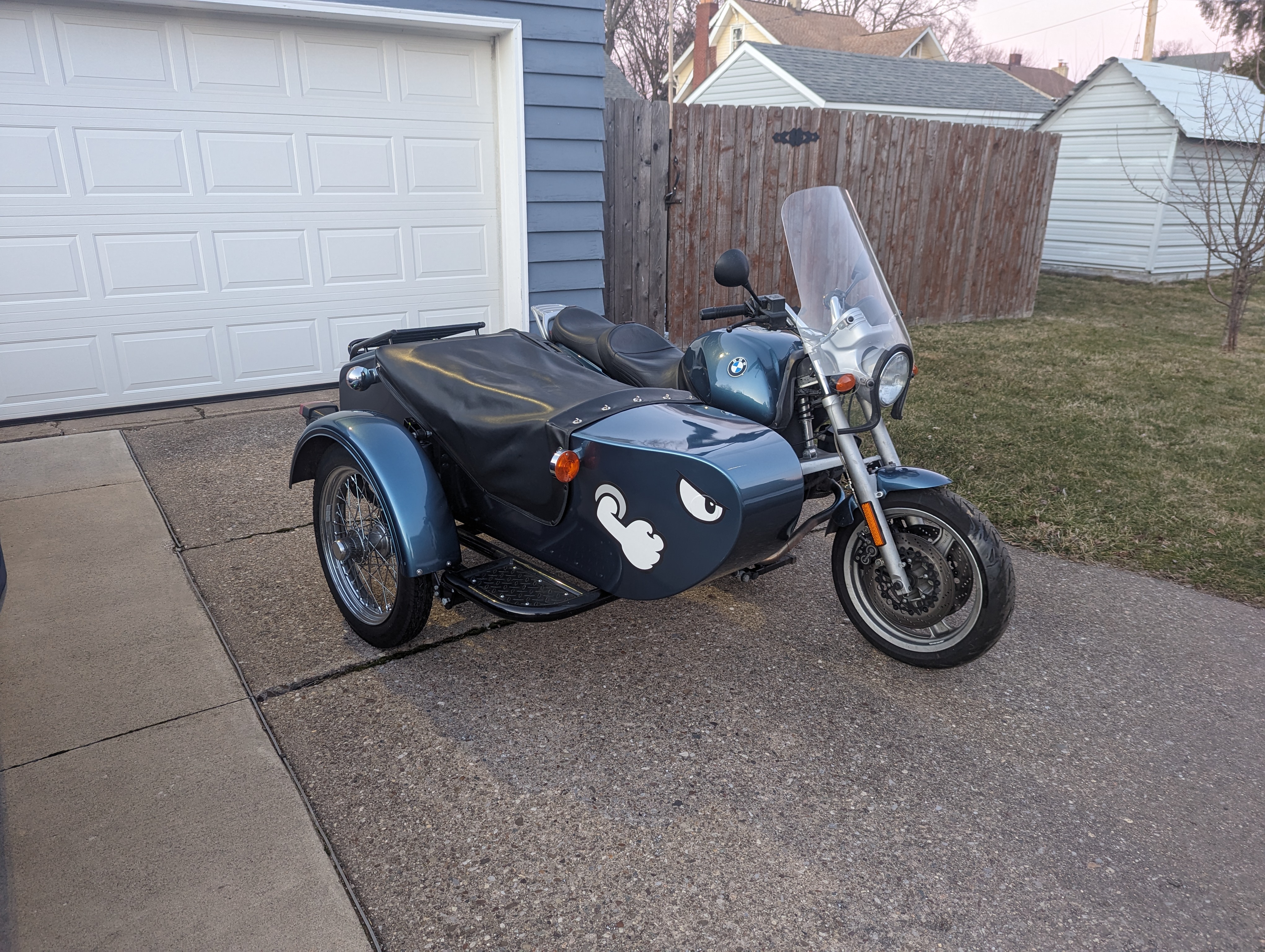 Looking to sell my sidecar rig for $10,000. It's a blue 1997 BMW R850-R with 44,418 miles and a DMC model M72 sidecar with a 19" wheel, luggage rack, windshield, and snap on tonneau cover. Rear bike tire is a 165-80-R15 car tire on a DMC conversion rim. Sidecar has "Bullet Bill" decals to resemble the Super Mario Bros character. New pic added showing mileage. Located in Canton, Ohio. I will try to add more pics as I get time. Clearly DRONE knows more details from the pics than I was ever provided with when I bought the rig at auction, so please feel free to refer to his comments for more info.